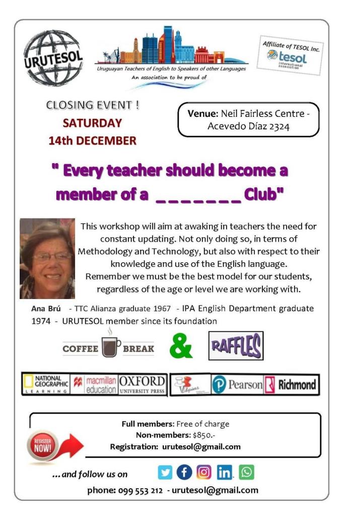 This workshop will aim at awaking in teachers the need for constant updating. Not only doing so, in terms of Methodology and Technology, but also with respect to their knowledge and use of the English language. Remember we must be the best model for our students, regardless of the age or level we are working with.