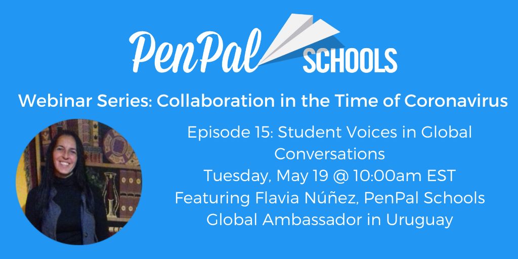 “Student Voices in Global Conversations” features PenPal Schools Global Ambassador Flavia Núñez in Uruguay. During this webinar, Flavia will share how her students are developing their voices through topics like “Earth Day Impact Challenge” and “A World of Poetry.”